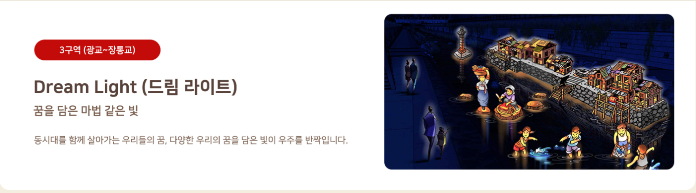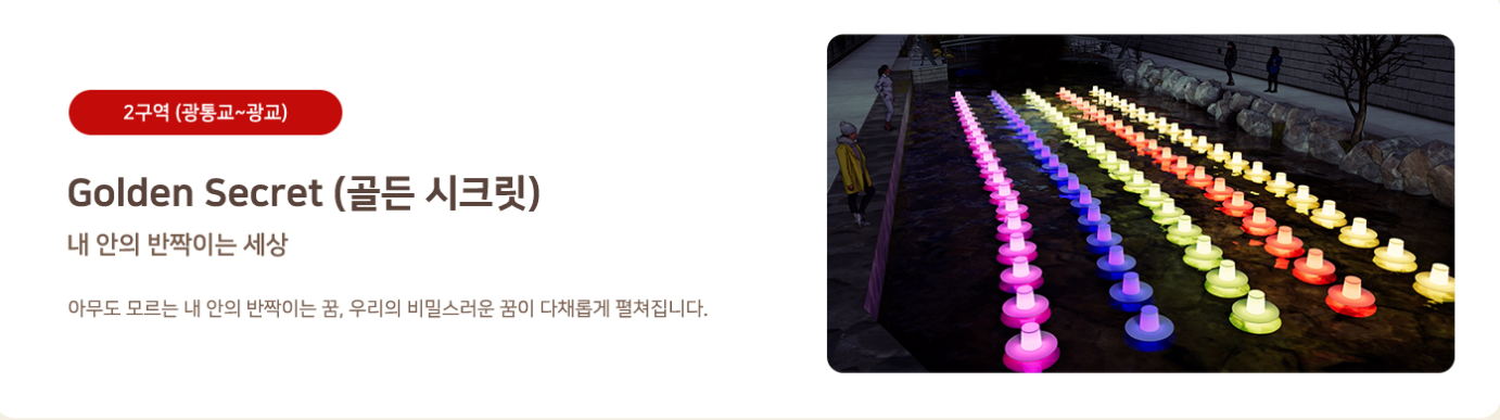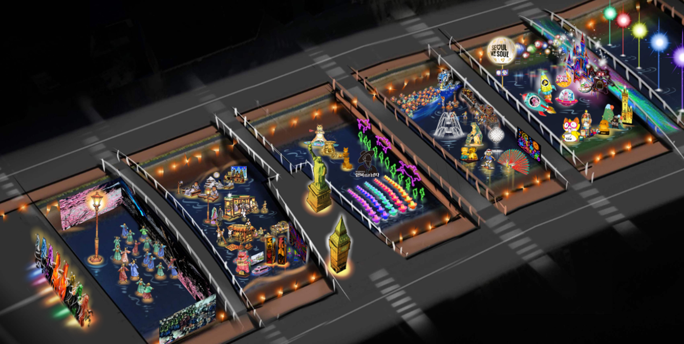 청계천 축제장은 총 4개 구역으로 테마가 나뉘어 있어요. 각 구간마다 분위기가 확 달라서 걷는 재미가 큽니다.